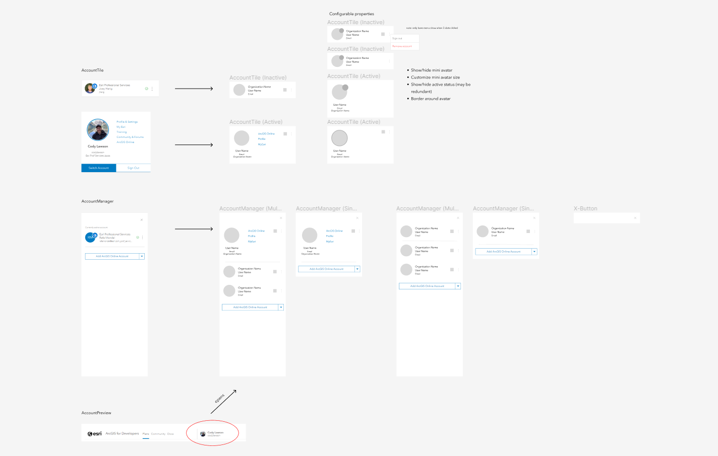 I then designed Figma protypes of the different components, which I have decided to sort into AccountTile, AccountManager, and AccountPreview. These components are based off the now deprecated Calcite-React components, and have configurable properties that are either unique to the new, more encompassing component, or are exposed from the existing calcite components they are dependent upon.