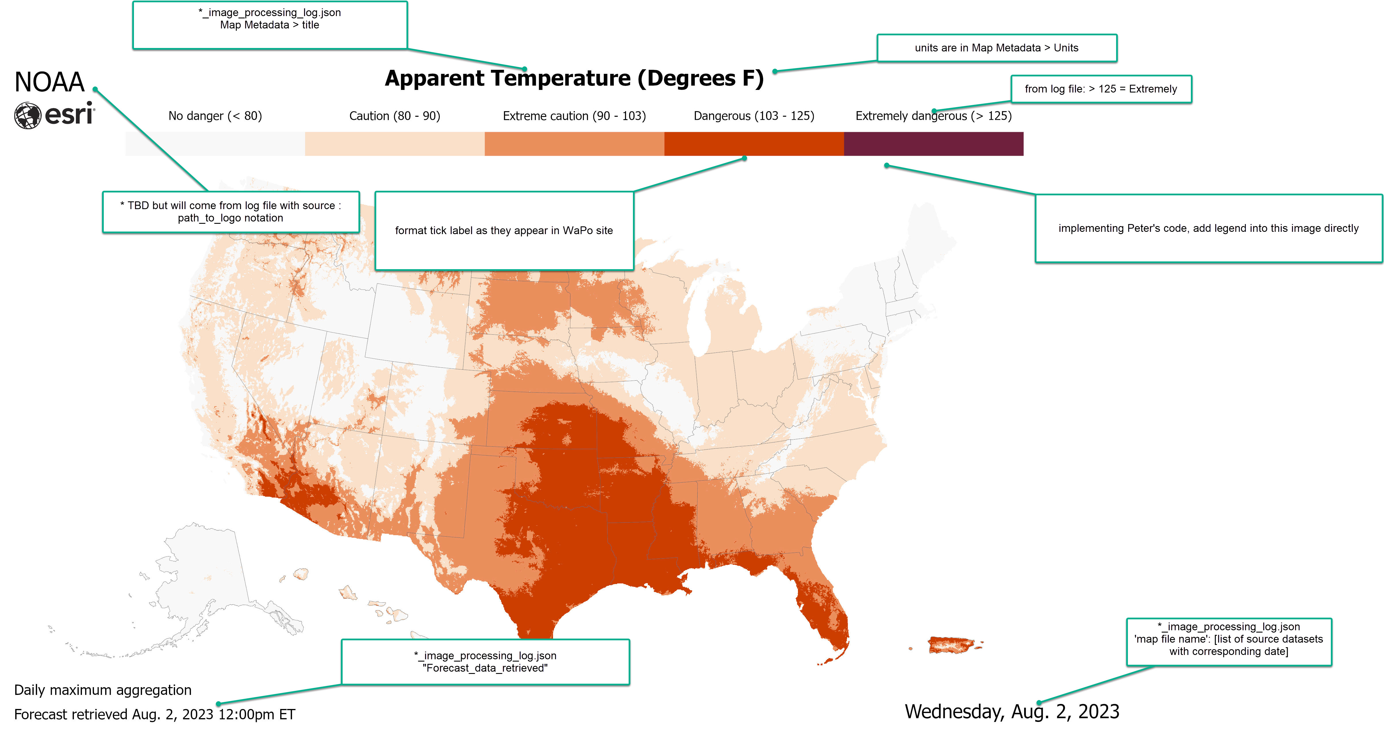 I structured my script to loop through each map type, and then each forecast day within each map type. With the known map type, or directory (dir), it would search into a JSON log file “*_image_processing_log” with the corresponding directory name. From there it would grab the map graphic title, units, source, forecast retrieval date (timestamp), and date (weekday). From there, I formatted accordingly: